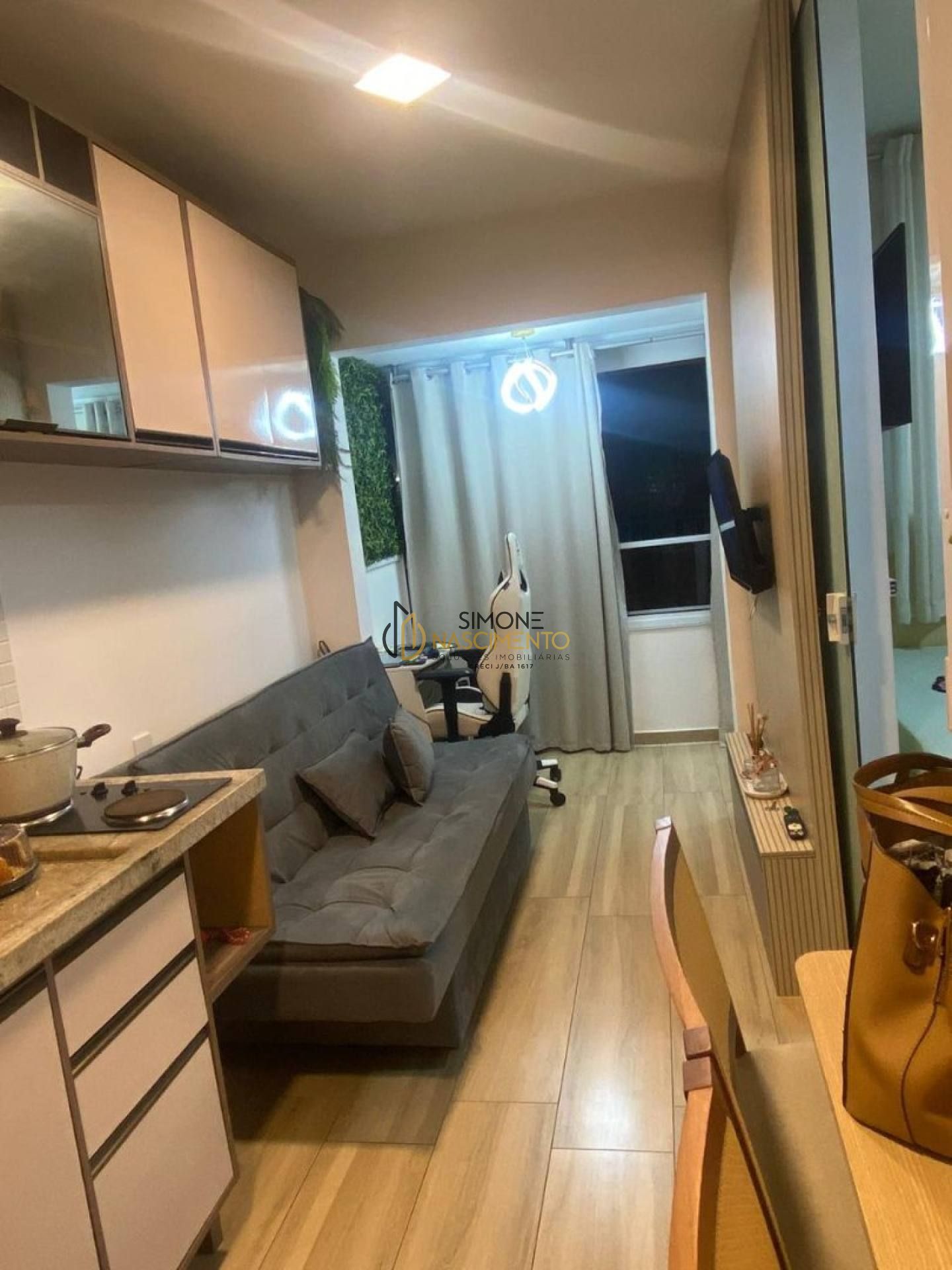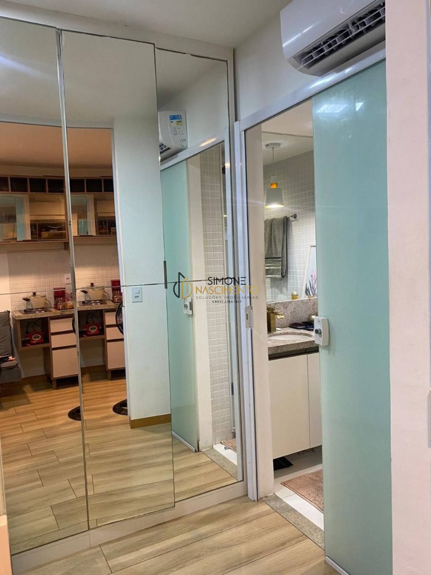 Possui 1 quarto, 1 banheiro, varanda, ar-condicionado e armários tanto na cozinha quanto no quarto.