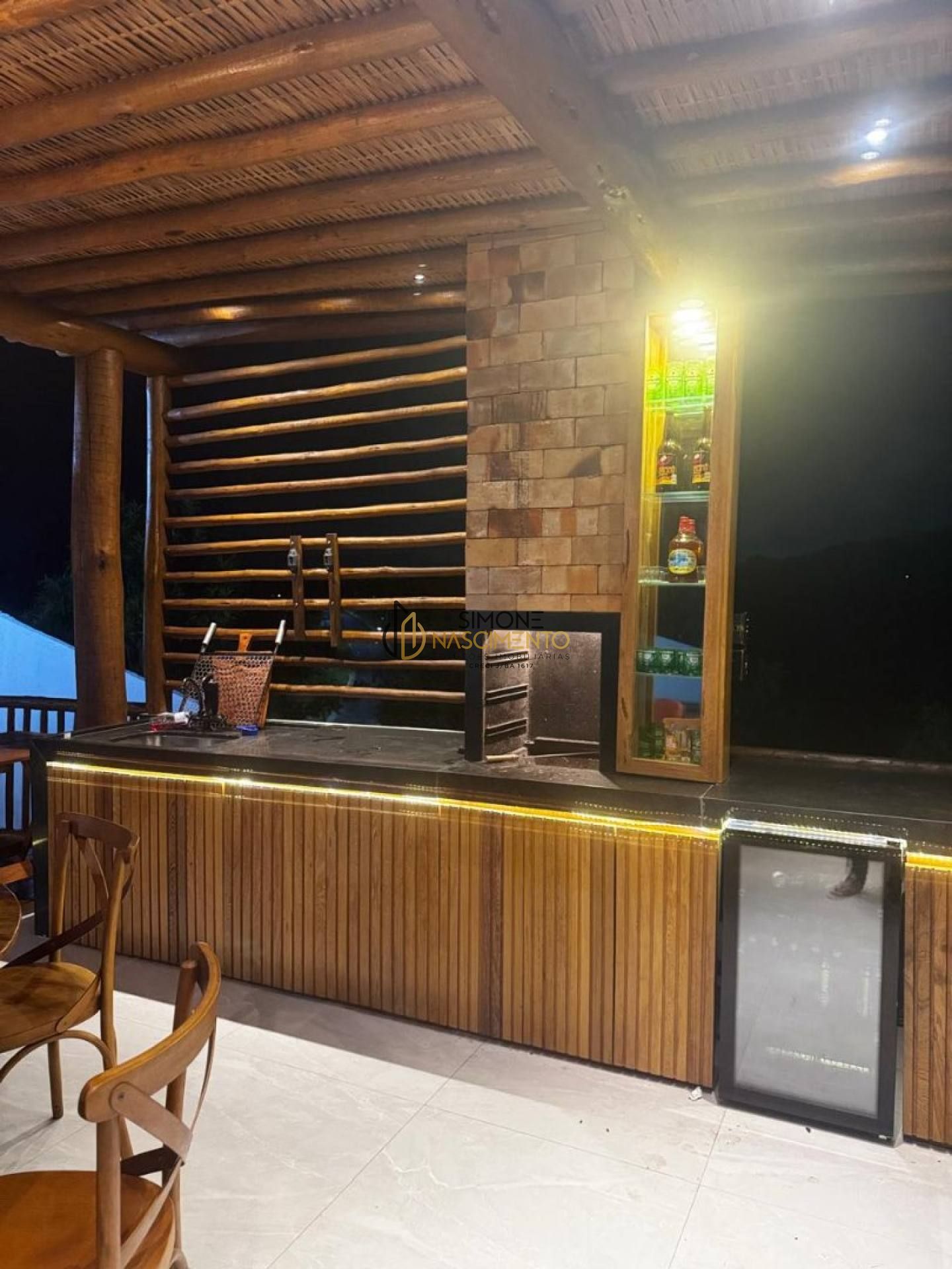 Área gourmet com churrasqueira, cervejeira e lareira