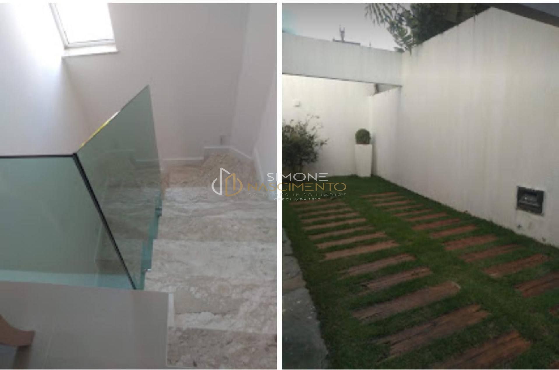 Escada com iluminação de degraus e guarda corpo de vidro;
