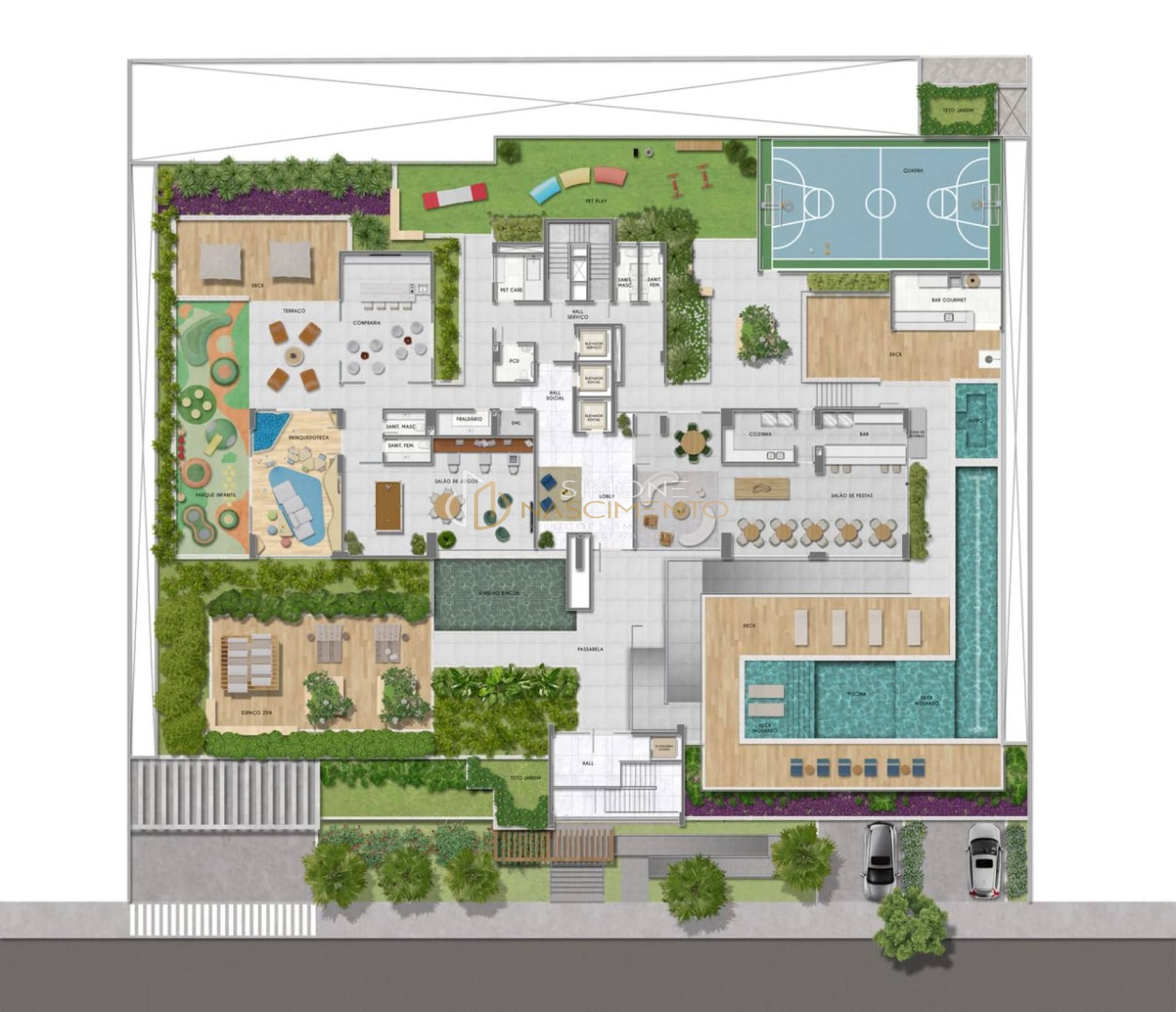 bar, brinquedoteca, quadra poliesportiva, espaço Confraria, pet Care e Pet Play,